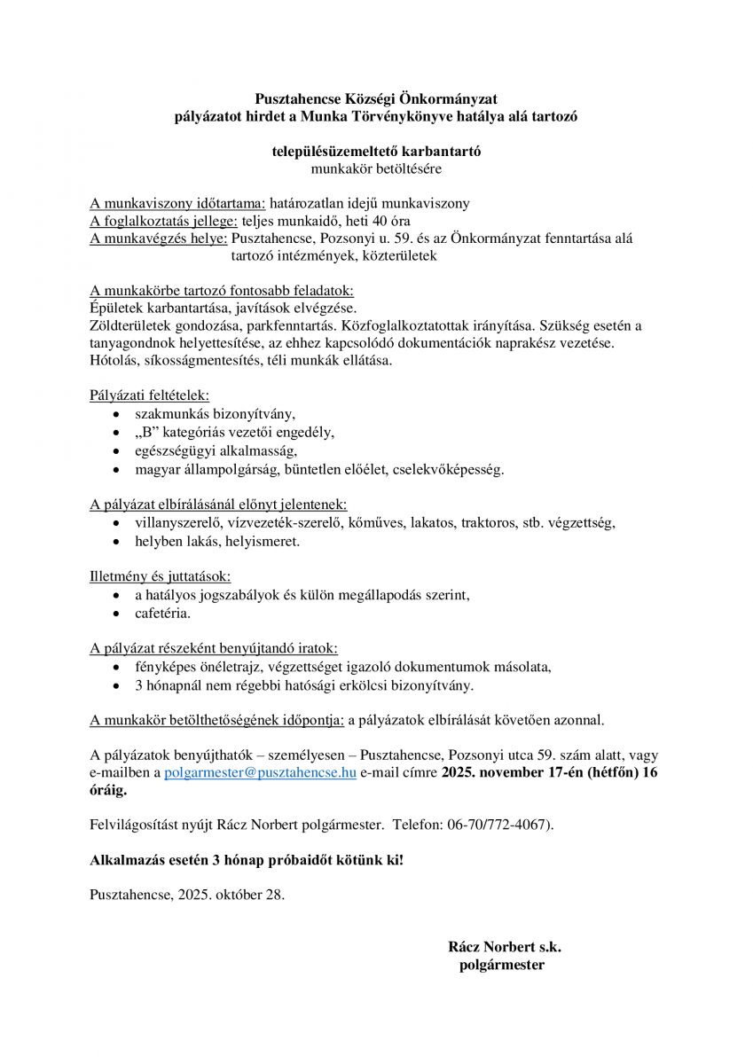 Pályázati felhívás településüzemeltető karbantartó állás betöltésére